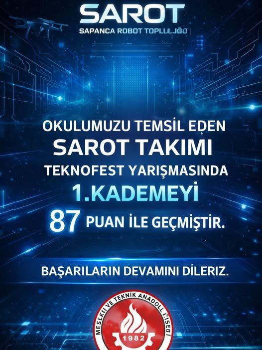 Sapanca Mesleki ve Teknik Anadolu Lisesi, Türkiye’nin en prestijli teknoloji etkinliklerinden TEKNOFEST‘te ilçeyi başarıyla temsil etti. Okulun SAROT (Sapanca Robot Topluluğu) Takımı, yarışmanın ilk aşamasını 87 puanla tamamlayarak bir üst tura çıkmaya hak kazandı. Bu gelişme, Sapanca’da eğitim ve teknolojiye verilen önemin somut bir göstergesi oldu.